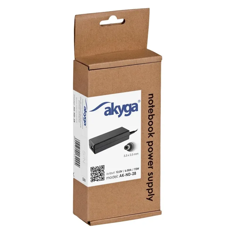 Zasilacz sieciowy Akyga AK-ND-28 do notebooka 12V/6,0A 72W 5.5x2.5 mm to zasilacz do laptopa o długości 1.20 m. Zapewnia zasilanie laptopa i ładowanie jego akumulatora.
