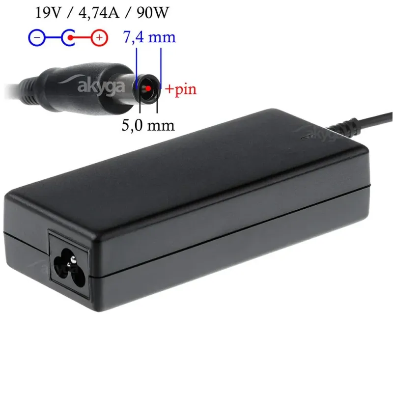 Zasilacz sieciowy Akyga AK-ND-04 do notebooka 19V/4,74A 90W 7.4x5.0mm + pin to zasilacz do laptopa o długości 1.20 m. Zapewnia zasilanie laptopa i ładowanie jego akumulatora.