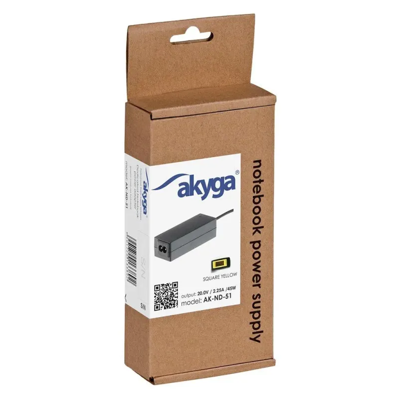 Zasilacz sieciowy Akyga AK-ND-51 do notebooka 20V/2,25A 45W Square Yellow to zasilacz do laptopa o długości 1.20 m. Zapewnia zasilanie laptopa i ładowanie jego akumulatora.
