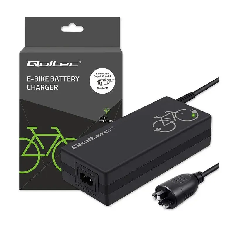 Ładowarka Qoltec do roweru elektrycznego 36V | 42V | 2A | wtyczka Bosch to ładowarka do samochodu elektrycznego o długości 0.90 m. Umożliwia ładowanie pojazdów elektrycznych w domu lub firmie.