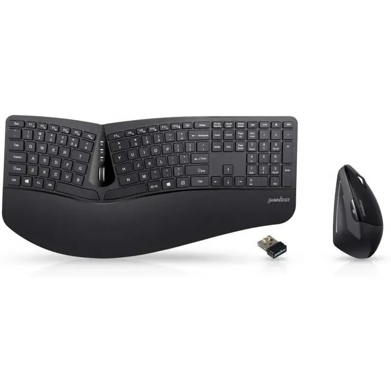 Ergonomiczny zestaw z klawiaturą i myszą Pionowa mysz z 5 przyciskami Zestaw zawiera 1 klawiaturę 1 mysz 1 podłokietnik 1 ruchomą podstawkę Technologia bezprzewodowa 2,4 GHz Klawiatura SPLIT-KEYBOARD dzieli klawisze na dwie grupy.
