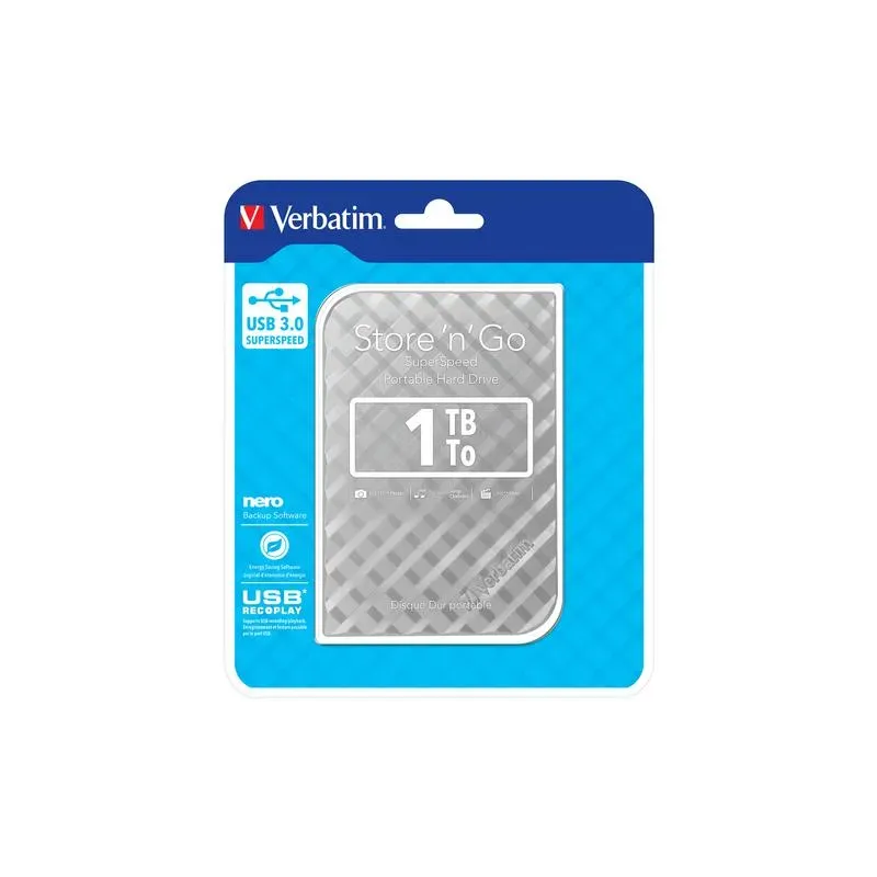 Dysk zewnętrzny Verbatim 1TB Store 'n' Go 2.5" srebrny USB to dysk zewnętrzny HDD o pojemności 1 TB. Umożliwia przenoszenie i archiwizację danych.